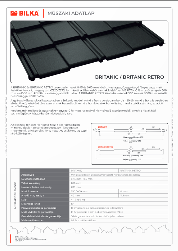 A BRITANIC  cserepeslemezek 0,45 és 0,60 mm közötti vastagságú, egyrétegű fényes vagy matt festékkel bevont, horganyzott (Z225-Z275) formázott acéllemezből vannak kialakítva. A BRITANIC fém tetőcserepek 500 mm és 4500 mm közötti hosszúsággal szállíthatók.